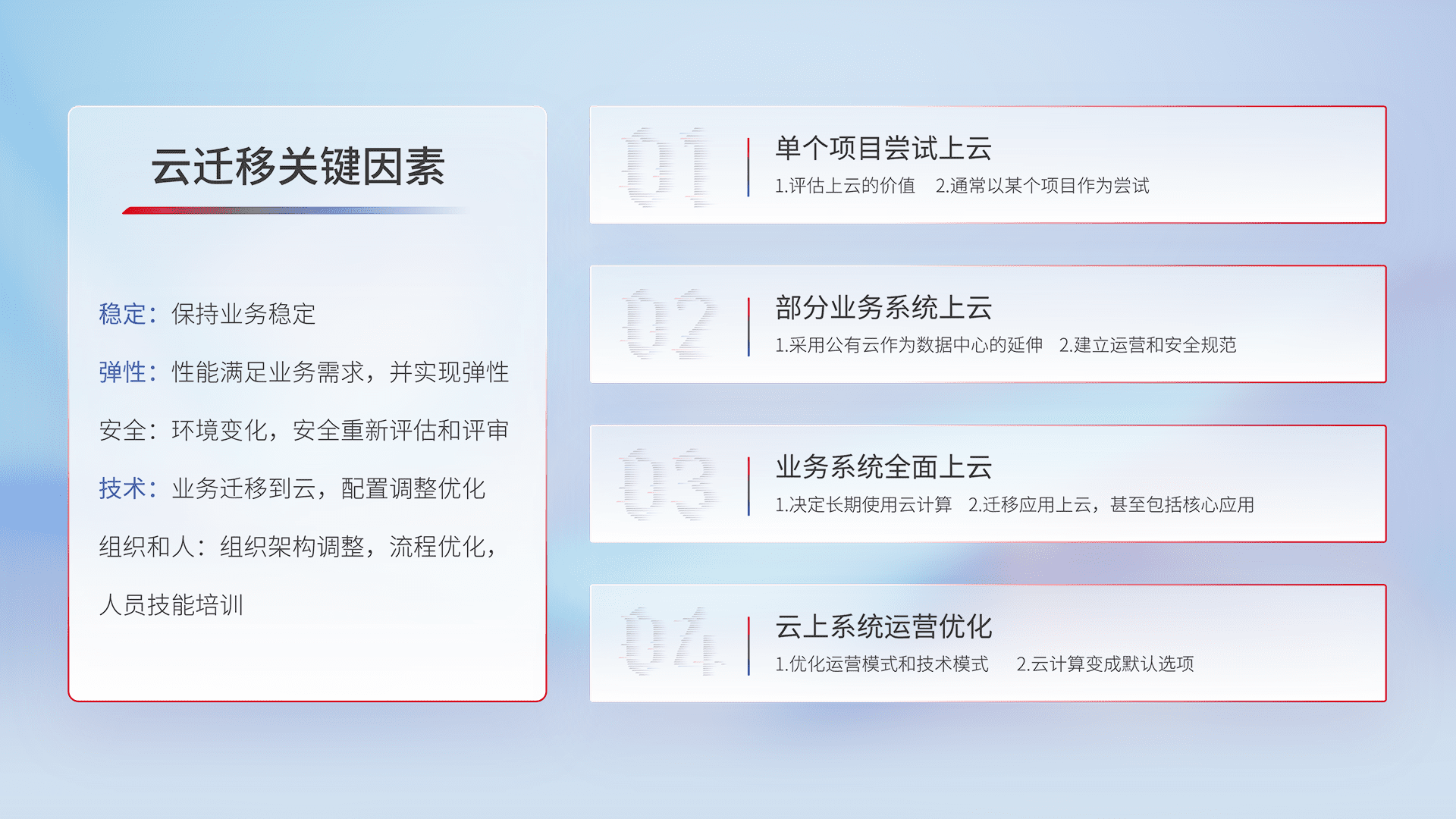 结合实际业务,,,从规划设计、、、云平台选型、、、云原生改造、、、数据迁移、、、集成交付,,,,迁移全过程为客户识别最佳上云路径,,,做好风险识别管理,,,设计网络架构、、身份权限、、、安全审计合规、、、、操作审计、、、日志审计、、、监控告警策略、、、多站点容灾设计等,,,,对云上基础设施进行整体规划,,提升IT治理水平,,,,以满足弹性、、、高可用、、、高性能的需求。。